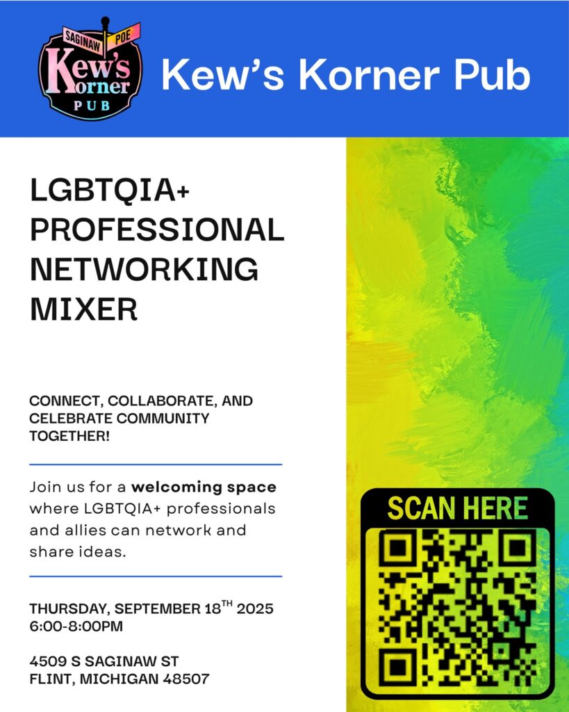 Come connect, collaborate, and celebrate community at Kew’s Korner Pub’s LGBTQIA+ Business Mixer! This event is all about bringing together LGBTQIA+ professionals, entrepreneurs, allies, and supporters from across Flint and beyond. Build relationships, swap referrals, and find new opportunities in a welcoming, inclusive, and come-as-you-are environment.